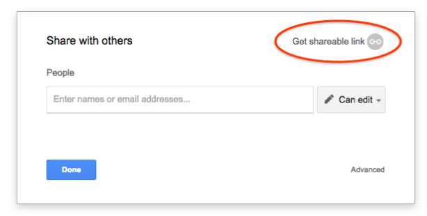 To give access to your content to others, click the blue “Share” button (or select a file/folder in Drive and click the person icon), and you’ll see a new “Get shareable link” button and grey icon in the upper right corner of the pop-up window. With one click on “Get shareable link,” you’ll see your file’s link appear and that the icon turns from grey to green, meaning that the file is ready to be shared with view-only access.